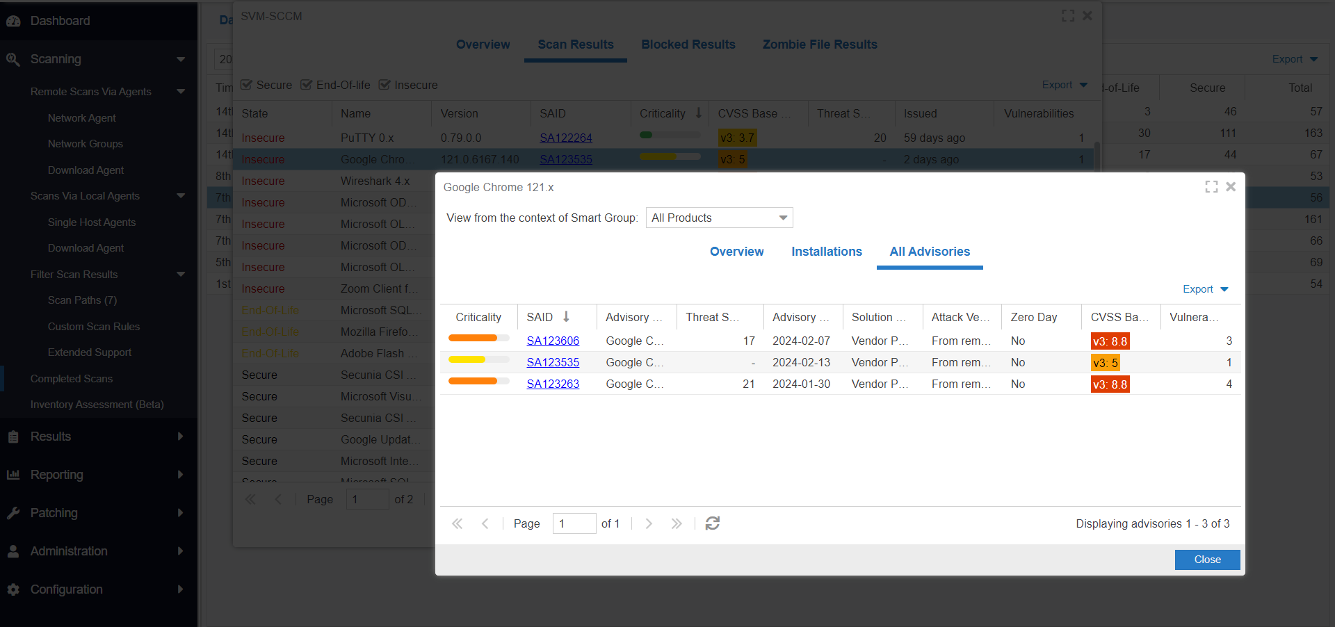When the user double clicks any of the products in the above screen, all the advisories related to that product appear along with their Threat Score.
