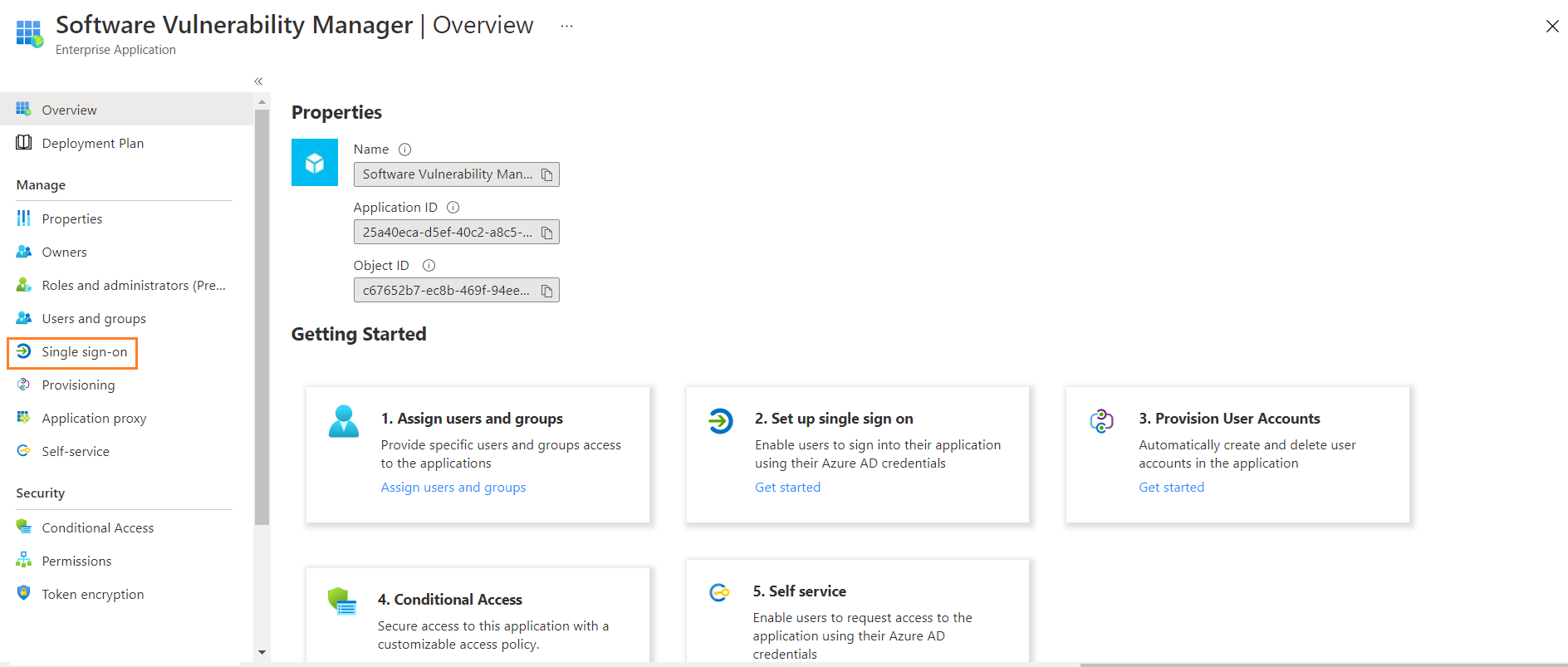 Select Single sign-on from the left pane. You can also select from the Overview page by clicking Set up single sign on under Getting started.