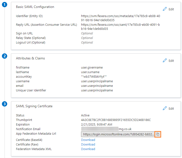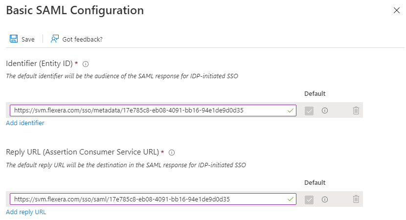 Copy the following from the Software Vulnerability Manager Configuration > Settings fields and paste in the Azure Single sign on > Set up Single Sign-On with SAML > Basic SAML Configuration: