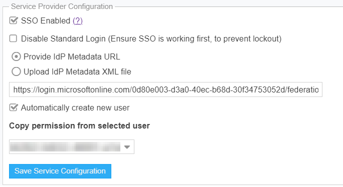 The Set up Single Sign-On with SAML page appears. Under SAML Signing Certificate field copy Metadata URL, login to Software Vulnerability Manager, browse Configuration >Settings > Service Provider Configuration, and then check SSO Enabled. Select Provide IdP Metadata URL and paste the copied URL into the text box.
