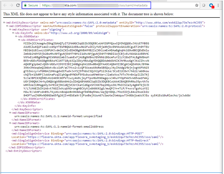 Copy the Identity Provider metadata context from Okta and save in XML format. When you select Upload IdP Metadata XML file, click Import XML, browse and select the XML file.