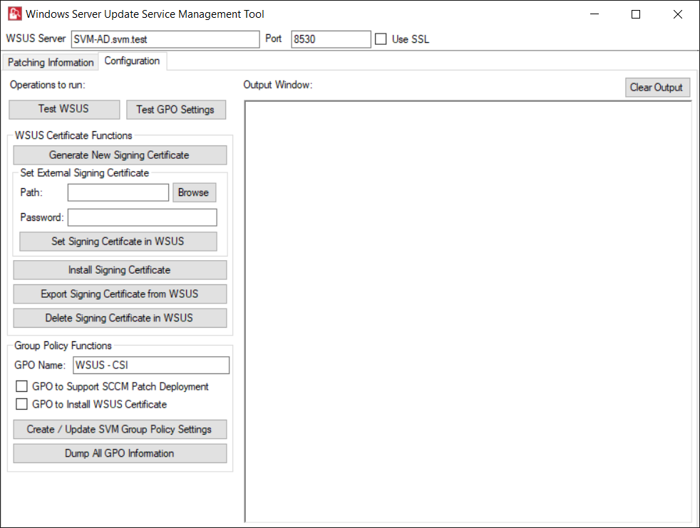 | Test WSUS | Click Test WSUS button, on successful connection you will receive a successful message in the Output Window. |