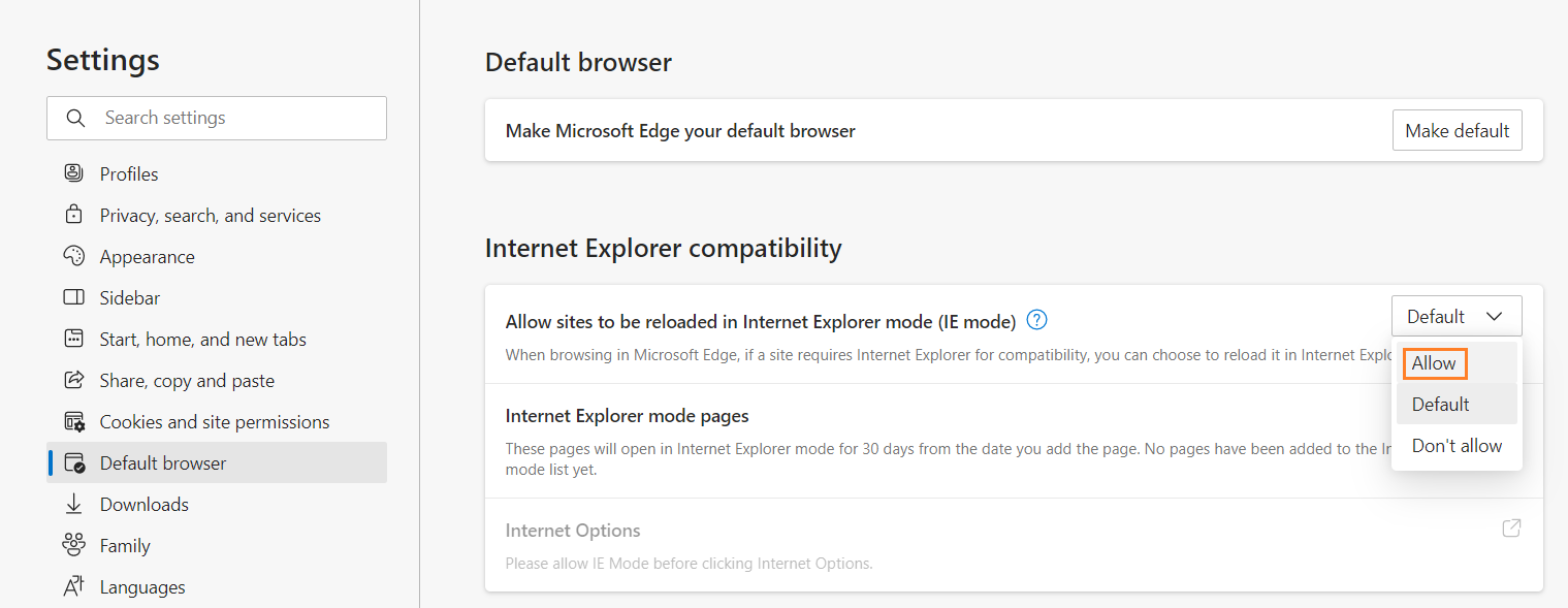 In the Default browser page, slide the Allow sites to be reloaded in Internet Explorer mode (IE mode) toggle to Allow.