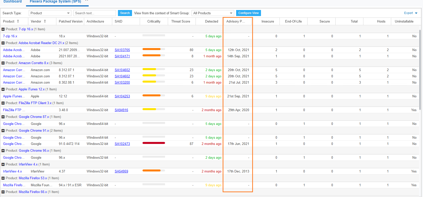In the Flexera Package System (SPS) ungrouped view which lists each product version separately, there will be no Secunia Advisory IDs (SAID) listed for End-of-Life (EOL) products. Therefore, the Advisory Published date will be blank for EOL products.