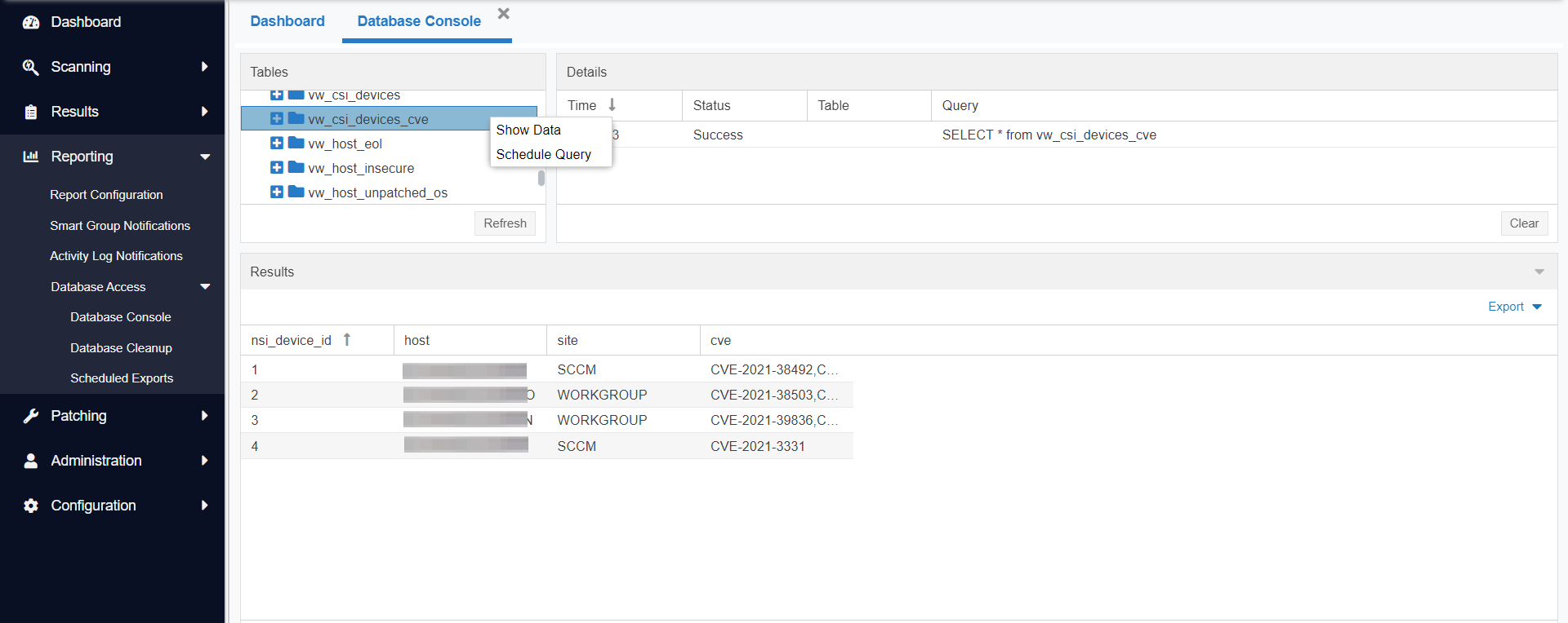 To create an SQL query, right-click a table and select Show Data to automatically create a SELECT * FROM table query from the specific table. You can also right-click a table and select Schedule Query to create Scheduled Exports for the table and save the output to a CSV file.