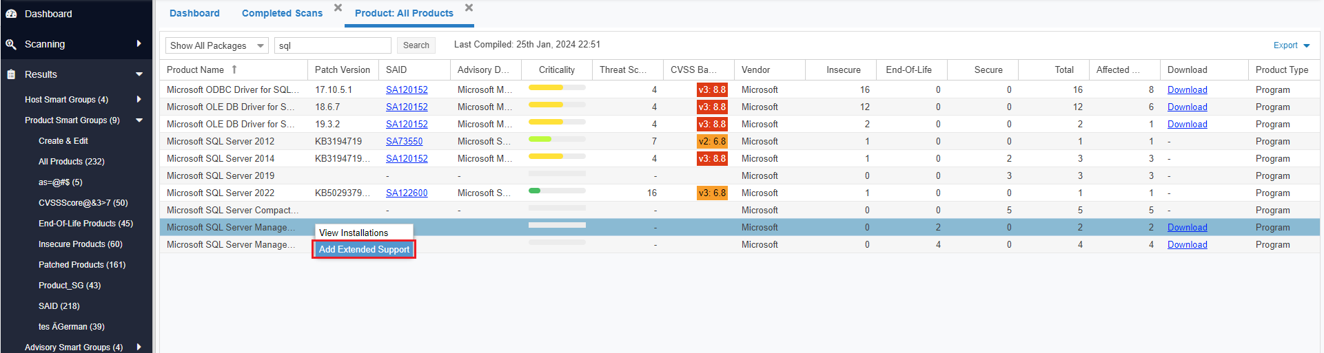 Extended support added for the selected product can be seen in the Scanning > Filter Scan Results> Extended Support.