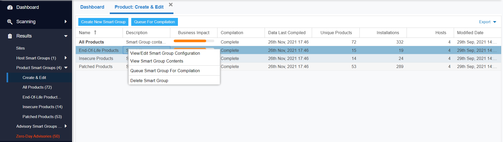 Use this page to view the existing configured Product Smart Groups and to configure new Smart Groups. Right-click an item in the grid to view, edit, compile or delete the Smart Group. To filter Product Smart Groups by the Last Scan Date, see Last Scan Date for Product Smart Groups.