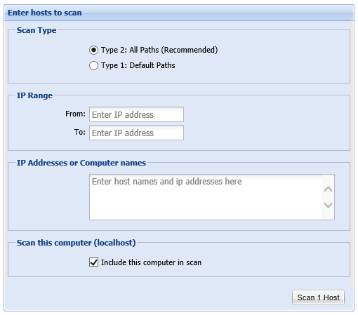 Use this page to conduct quick, on-demand, scans from your Software Vulnerability Manager console against remote hosts on your network or your local PC. Enter the scan type and IP address range for the hosts you wish to scan in the Enter hosts to scan screen and click Scan Hosts.
