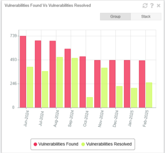 Vulnerabilities Found vs. Vulnerabilities Resolved widget use to enhance security visibility and tracking.